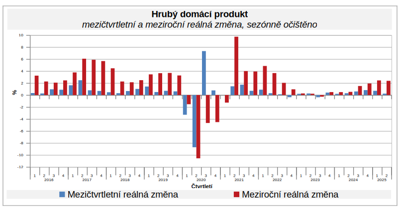 Česká ekonomika postupně oživuje. Podle předběžného odhadu ČSÚ vzrostl HDP v prvním čtvrtletí letošního roku v mezičtvrtletním vyjádření o 0,5 %, meziročně o 2 %. Růst je tažen především spotřebou domácností, která je podpořena obnoveným růstem reálných příjmů a zmírňováním restrikce měnové politiky. Na druhou stranu zahraniční poptávka zůstává utlumená, což pramení zejména z poklesu evropského průmyslu. Ten čelí vysokým cenám energií, strukturálním problémům a nejistotě spojené s obchodní politikou USA.